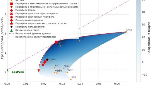 Что такое риск Риском на финансовых рынках с торговлей рисковыми активами считается волатильность. Волатильность, это колебания доходности актива, относительно их долгосрочного тренда. А рисковый актив, это такой актив, у которого имеется такая волатильность. Актив считается безрисковым, если его доходность растет без таких колебаний (например, как банковский депозит). Измеряется риск в числах в виде стандартного отклонения доходностей актива (или портфеля) относительно его средней доходности. То есть риск, это корень квадратный из дисперсии доходности актива (или портфеля)...