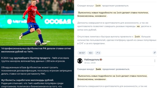 Как зарегистрированной в РКН российской сетке telegram-каналов "Двач" прорекламировать нелегальную букмекерскую контору 1Win? Правильно, подать рекламу так, будто бы это не реклама, а самая обыкновенная новость, в данном случае о неких 14 футбольных игроках, делавших там ставки. Нарратив, аналогичный многочисленной рекламе из сериалов, Отсутствие лимитов и быстрые...