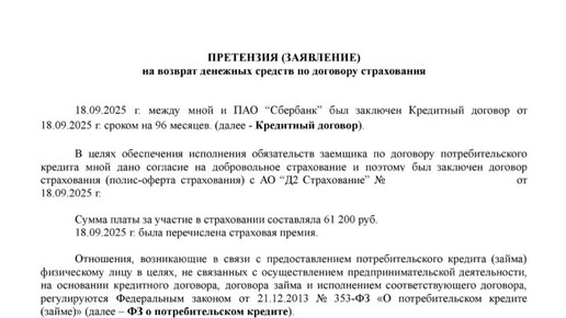 Давайте разберём, как вернуть деньги за навязанную услугу страхования, если вы столкнулись с подобной ситуацией при оформлении автокредита. К нам обратился клиент, оформивший автокредит в ПАО «Сбербанк». При подписании договора ему навязали договор страхования по программе «КАСКО Плюс» от АО «Д2 Страхование» на сумму 61 200 ₽. Данная программа предлагает расширенный пакет страховых услуг (КАСКО) — защиту автомобиля от повреждений, угона, аварии и др. Однако в реальности: 📌 Отказ от услуги не влияет...