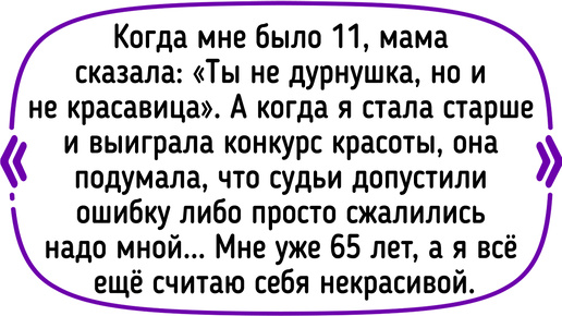 Все мы в детстве слышали, что родители желают нам только добра, даже когда говорят неприятные вещи. Но порой мамы и папы бросают неосторожные фразы, которые оставляют неизгладимый след в душе ребенка. Пользователи сети рассказали, какие слова родителей они спустя годы вспоминают со слезами на глазах. А в конце статьи — бонус о том, что материнская поддержка творит чудеса. 1. Всякий раз, когда мама снимала меня или водила к профессиональному фотографу, она говорила: «Не улыбайся так фальшиво! Ну-ка, поискренней!» Она даже не догадывалась, как действовали на меня эти слова...