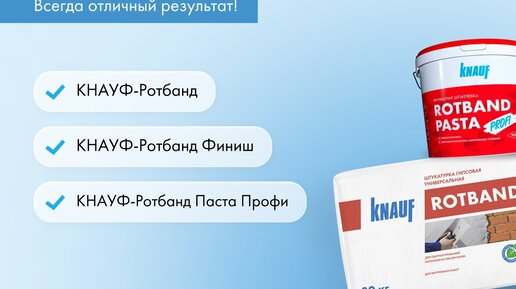 В данном случае, РОТБАНД - относится уникальной и самой распространенной гипсовой штукатуркой, которую производит самая распространенная компания КНАУФ. Ею можно штукатурить, выравнивать стены и потолки внутри помещения...