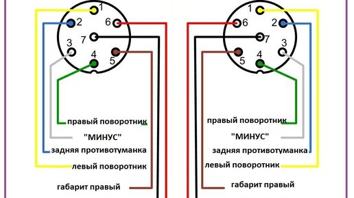 Распиновка контактов розетки "фаркопа" самого распространенного 7-контактного типа . Если у вас в авто предусмотрено использование блока согласования, его можно заменить набором из 4-х реле. Нагрузка на реле катушки небольшая, ошибку автомобиль не увидит...