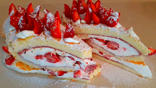 Бисквитный рулет с клубникой и взбитыми сливками!