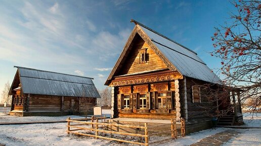 Старинная русская деревня в глуши. Ярославская область. Резные дома