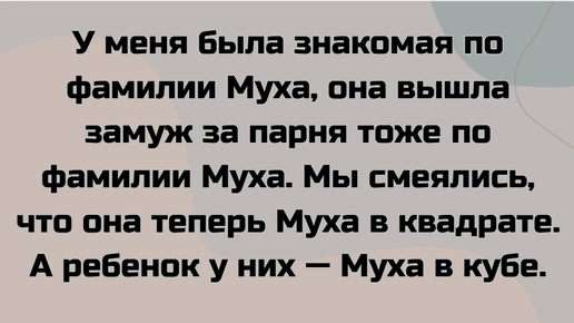 Необычная фамилия может с легкостью превратить жизнь в настоящий каламбур. И неважно, досталась она от родителей или второй половинки. В любом случае по пятам за ее владельцем идут любопытные ассоциации и комедийные истории. Рекомендуем также заглянуть сюда 👇👇👇 В институте работали Хлебников и Масленникова. Поженились. Стали называть Бутербродниковыми. © Елена Промет В молодости знала семью по фамилии Неешьпапа. Супруга в девичестве Огурцова, менять фамилию не хотела, но муж настоял, смирилась...