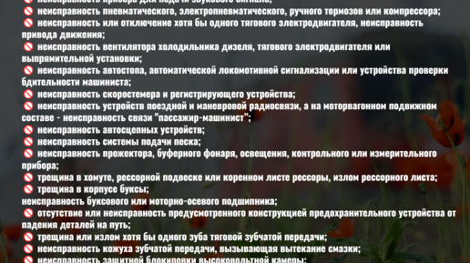 Продолжаем экскурс в тонкости эксплуатационной работы железнодорожного транспорта. Ниже представлены требования к неисправностям, с которыми не допускается выпускать локомотивы, моторвагонный и специальный самоходный подвижной состав на линию. Порядок вождения поездов машинистами локомотивов, моторвагонного и специального самоходного подвижного состава. Обязанности при ведении поезда. Обязанности...