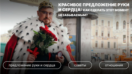 Предложение руки и сердца – это один из самых значимых моментов в жизни каждой пары. Для многих это не просто формальность, а настоящий ритуал, который знаменует начало нового этапа отношений. Красивое и запоминающееся предложение может стать отличным началом вашей совместной жизни, а чтобы оно было действительно незабываемым, важно продумать каждую деталь. Предложение руки и сердца — это не просто вопрос. Это история, которая останется в памяти на десятилетия. За 12 лет работы «Ради Любви» организовали более 5 000 предложений — от подводных признаний в Байкале до небесных феерий над Москвой...