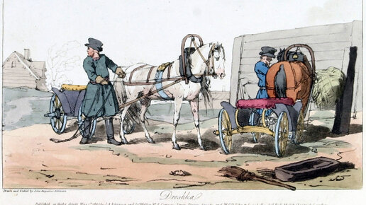 Дрожки – уменьшительное от дрога. В данном случае дрога – балка, соединяющая передний и задний ход. Дрожка – короткая балка. Применительно к транспортному средству означает экипаж с короткой базой (у которого задний и передний ход соединены короткими дрогами – дрожками). Термин очень многозначный и в России существовало с десяток разновидностей дрожек. На рисунке Аткинсона мы видим извозчичьи дрожки с извозчиками. К сожалению Аткинсон не дает описание дрожек – только живописует особенности русских извозчиков...