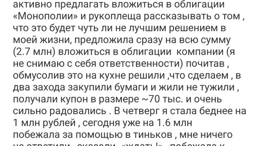 Друзья это не реклама, хотя конечно каждый может считать как хочет) Буквально сейчас вижу такие комменты под Монополией. Это жутко, я понимаю и конечно не осуждаю комментатора, это очень тяжело. Но что хочется сказать, несколько важных правил. 1. Разбираетесь самостоятельно в инструменте Прочесть что такое облигации 2 -3 часа времени. (Облигации это значит дали кредит компании, если у компании все хорошо она заплатит, если плохо - у Вас будет тоже) 2. Пройдите обучение в Т - Инвестициях - делов на 2-3 часа, но это ведь блин Ваше будущее, акститесь! 3...