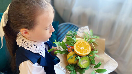 Всем доброго времени суток! Давно меня здесь не было,буду исправляться!) Хочу предложить вам очень интересную идею букета.Но,не совсем обычного а из фруктов.Очень полезный букетик получится👌А вкусный какой…! На фото можете увидеть пример того как его сделать. Букет делала нашему классному руководителю на День знаний 📚 Как же он красиво и необычно выглядит😌 С таким букетом вас точно запомнят👌🤤 А теперь расскажу о том как же его собрать. На самом деле все очень просто,нужно только приготовить все необходимое...
