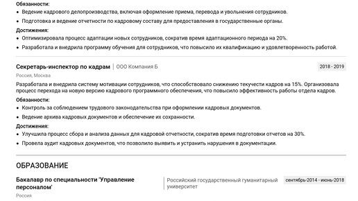 Пример резюме секретаря-инспектора по кадрам 2025 - Как составить