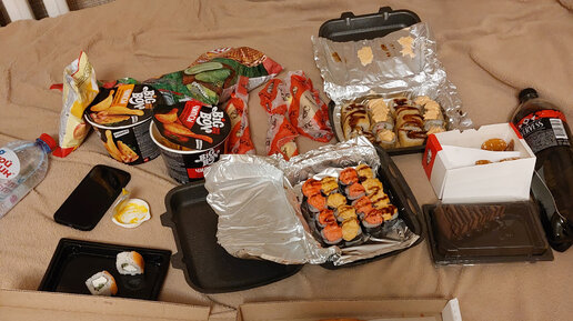 Приехав в новый город, я решила повторить популярный эксперимент в домашних условиях при небольшом весе в 65 кг и съесть 10.000 калорий. Все началось с небольшого набора из KFC, пиццы и 48 роллов. Вначале я была на диком энтузиазме, пицца и фаст фуд залетали на ура. 3 айтвистера из KFC и байты с курицой составили уже 1050 калорий. Это было только разогревом! Съев половину пиццы 30см (500 калорий) и сырные медальоны с картошкой фри (400 калорий), почувствовала сильную тяжесть. Появилась лень, но я продолжала есть и с фильмом удалось осилить пачку чипсов (480 калорий)...