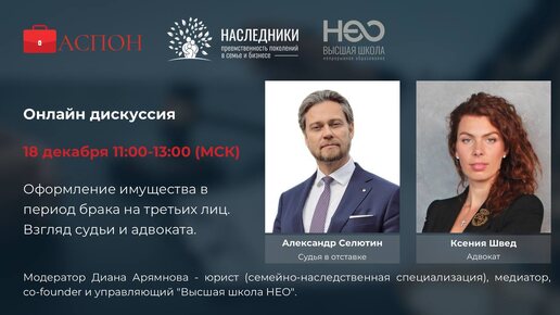 Оформление имущества в период брака на третьих лиц. Взгляд судьи и адвоката. Дискуссия 18.12.2025 в 11:00 по мск времени с Александром Викторовичем Селютиным, адвокатом, к.ю.н., доцентом и судьей в отставке, а также с Ксенией Швед, адвокатом, к.ю.н, медиатором и членом международной ассоциации семейных юристов IAFL. Вопросы к обсуждению: - Мотивы и способы оформления имущества супругами на третьих лиц в период брака. - Наиболее популярные схемы вывода активов из режима совместной собственности;...