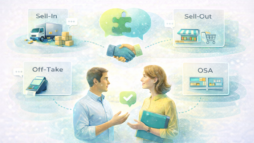 В FMCG «не сходятся» не только отчёты - часто не сходятся слова. Один говорит «продажи», второй тоже говорит «продажи», а обсуждают разные вещи. Договоритесь о терминах - это экономит нервы, время и деньги. Важно: у многих производителей нет дистрибьюторов (только прямые продажи). Но при этом почти всегда есть полевые команды и полка. Поэтому ниже - термины, которые работают в обоих сценариях. Три слоя продаж (главная причина споров) Мини-правило: если на встрече звучит «продажи» - уточните, о каком слое речь (sell-in / sell-out / off-take)...