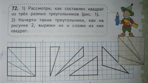 ШКОЛЬНИК2 года назадПодписаться1)Рассмотри,как составлен квадрат из трёх разных треугольников.2)Начерти такие треугольника,как на рисунке 2,вырежи их и сложи из них...