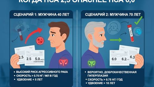 Вот что не говорят урологи: абсолютное значение ПСА не так важно, как его ДИНАМИКА и СКОРОСТЬ роста. - Норма: до 4.0 нг/мл (но это условно) - Повышается при раке, аденоме, простатите, после секса - 40-49 лет: до 2.5 нг/мл - 50-59 лет: до 3.5 нг/мл - 60-69 лет: до 4.5 нг/мл - 70+ лет: до 6.5 нг/мл Сценарий 1: мужчина 40 лет - ПСА 2,5 – на верхней границе для возраста - Через год 3,5 – рост на 40% за год - Через 2 года 5,0 – удвоение за 2 года - ВЫСОКИЙ риск агрессивного рака Сценарий 2: мужчина...
