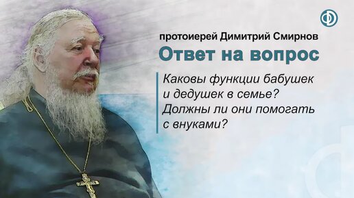 Ответ протоиерея Димитрия Смирнова на вопрос из видеозаписи прямого эфира радио "Радонеж" от 20 апреля 2013 года. Прот. Александр Березовский: Наталья из Кирова: «Очень устала от повседневных забот и проблем, хочется немого отдохнуть, но родители не очень-то стремятся помочь: “Это ваши дети и вы должны ими заниматься”. Подскажите, каковы функции бабушек и дедушек, и как мне расценивать в этом случае понятие семьи? Долгие годы гложет обида, никак не могу с ней справиться». Прот. Димитрий Смирнов: Семья – это папа, мама и дети...
