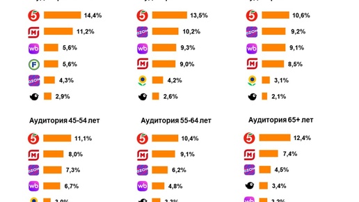 Топ сетевой розницы, или где закупаются россияне РОМИР составил рейтинг сетевого ритейла в денежном выражении за 2 квартал 2025 года, показав, как распределяются траты россиян в зависимости от их возраста. 🔸 Первую строчку рейтинга занимает «Пятёрочка» вне зависимости от возраста покупателя. 🔸 На втором месте у молодежи до 24 лет и у категорий 45–54 и 65+ «Магнит у дома», а у 25–44-летних – Ozon. 🔸 Третье место делят Ozon и Wildberries. 🔸 В рейтинг вошел и «Чижик», который на рынке ритейла сравнительно недавно...