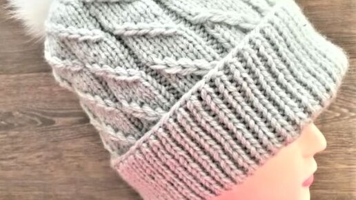 Шапка спицами 58 размера, расчет петель и готовое изделие с помпоном из песца📌