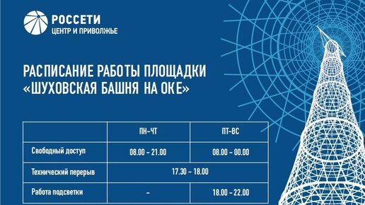 С наступлением холодного времени года с 11 ноября поменялся график работы подсветки Шуховской башни, находящейся в поселке Дачный в пригороде Дзержинска. Свободный доступ на площадку открыт каждый день: в рабочие дни - с 8: 00 до 21: 00, в пятницу и выходные дни – с восьми утра до полуночи. При этом есть ежедневный перерыв с 17: 30 до 18: 00. Подсветка башни с 11 ноября будет...