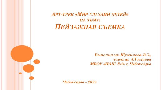 МБОУ "Начальная общеобразовательная школа №2" г. Чебоксары3 года назадПодписатьсяАрт-трек "Мир глазами детей". Пейзажная съёмка. Автор: Шумилова Виктория, МБОУ "НОШ №2" г. Чебоксары