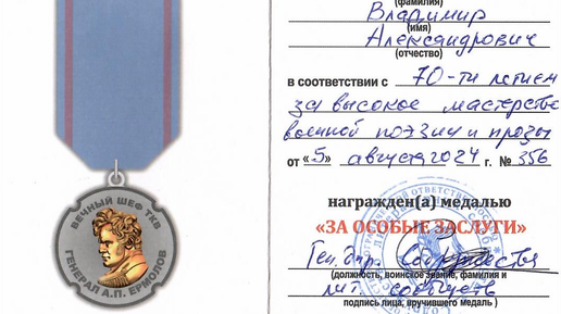 В честь 70-тилетия академик ИАСК Силкин Владимир Александрович Содружеством литературных сообществ, возглавляемым Бухаровым Александром Николаевичем, удостоен награды – медаль Генерала А.П.Ермолова. Содружество...