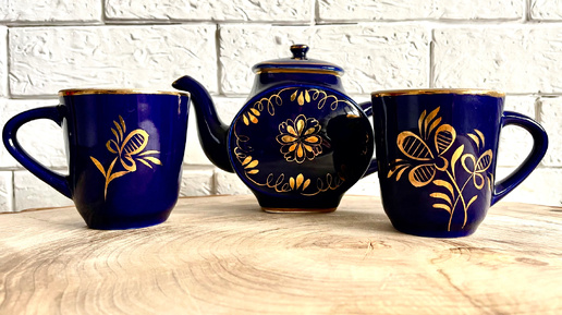 Ой, какой милый чайничек с чашечками! Кто же такую милоту сотворил? Задумалась я разглядывая эту сине-золотую прелесть. "Гжель? Да ладно! Гжель же должна быть бело-голубая, и ничего лучшего! Откуда тут золото, ну точно китайская подделка! Стоп, стоп, стоп! Не спешите выносить вердикт и отправлять мой чайник в ссылку на дальнюю полку! Все мы привыкли к классической расцветке Гжели, но давайте разберемся, откуда взялось это сочетание цветов и почему у меня (и, возможно, у вас тоже) вдруг появился темно-синий товарищ с золотыми завитушками...