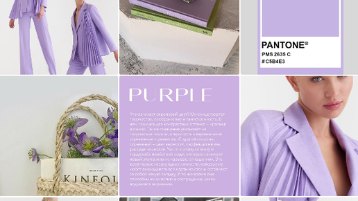 Он олицетворяет творчество, воображение и таинственность. В нем сошлись два контрастных оттенка — красный и синий. Такое смешение указывает на творческие поиски, открытость к переменам и стремление к развитию. С другой стороны, сиреневый — цвет верности, перфекционизма, рассудительности. Часто к этому оттенку в гардеробе прибегают люди, которые начинают новый этап в жизни, карьере, отношениях...