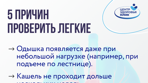 Но как понять, что с ними все в порядке? Собрали 5 важных симптомов заболеваний легких, которые не стоит игнорировать. Центр здоровья НЛМК оснащен высокоточным оборудованием, которое поможет выявить заболевания на начальных стадиях: Не ждите, пока «пройдет само». Дышите полной грудью...
