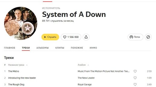 Всем привет. Вы могли заметить, что в Яндекс Музыке стало невозможно найти некоторые песни, которые там всегда были. Я нашел способ решить эту проблему: инструкция поможет найти утраченные песни, добавить их в плейлист и скачать на устройство. В этой статье я буду показывать примеры с песнями группы System of a Down, но работает она и на другие песни. А в чем проблема? Вот в чем. Если в Яндекс Музыке ввести в поиск System of a Down, можно увидеть вот такую страницу группы: полтора миллиона лайков и всего 90 тысяч слушателей за месяц...