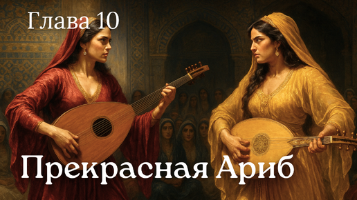 Глава 10. Гнездо сплетённых гадюк Утро в Багдадском дворце распускалось обманчиво нежным лотосом. Сквозь ажурные решётки окон просачивался жемчужный свет, окрашивая мозаичный пол в розовые и золотистые тона. В садах заливались соловьи, живые, ещё не знавшие лезвия, а мерное журчание воды в каналах из белого мрамора убаюкивало, словно шёпот кормилицы. Батл между Ариб и Шария. Рисунок генерирован ИИ Но Ариб не спала. Певица сидела у распахнутого окна, не отрывая взгляда от свинцовых вод Тигра. На низком столике белел пергамент, покрытый стремительной вязью стихов...