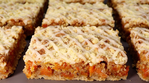 Сегодня один из самых вкусных пирогов. Печётся просто и быстро, справится каждый. Здесь два вида теста – песочное и бисквитное, большое количество кураги и орехов, а сверху сеточка из глазури, которая завершает прекрасное сочетание вкусов! ИНГРЕДИЕНТЫ: Тесто № 1: мука - 270 г сахар 150 г сливочное масло - 220 г орехи грецкие - 100 г Тесто № 2: мука - 90 г разрыхлитель - 1 ч.л. соль - 0,5 ч.л. сахар - 250 г ванильный сахар - 10 г яйца - 4 шт. курага - 270 г орехи грецкие - 100 г Крошка: мука - 100 г сахар - 40 г масло сливочное - 50 г Глазурь: сахарная пудра - 100 г апельсиновый сок - 3-4 ст...