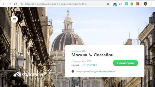 В эфире непостоянная рубрика обзоров приложений для путешественников. Сегодня у нас свежее расширение для браузера Google Chrome и его производных. Расширение называется "Путешествие дня от Skyscanner". Посмотрим повнимательнее и узнаем, что оно умеет. Расширение заменяет собой содержимое новой вкладки. Каждый раз, открывая ее, вы будете видеть сегодняшнее путешествие дня от Скайсканера. Алгоритмы нам неведомы, но выбираются направления с наибольшей скидкой от обычной цены на сегодня. Обновляются раз в сутки...