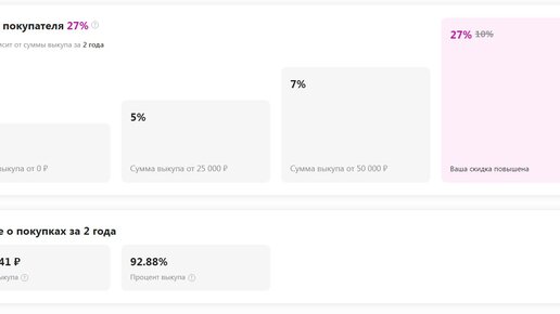 На Wildberries существует индивидуальная система скидок для покупателей. При расчете процента скидки учитывается сумма и процент выкупа за 2 года. Чем эти цифры больше, тем большую скидку можно получить. Стандартная лестница скидок: 3, 5, 7 и 10 %. Но маркетплейс для стимуляции продаж предоставляет повышенную скидку постоянного покупателя. На данный момент ее максимальный размер — 27%. Согласно оферте Wildberries именно маркетплейс берет на себя расходы по скидке постоянного покупателя. Он возмещает продавцу разницу между заявленной ценой товара и той, за которую приобрел покупатель...