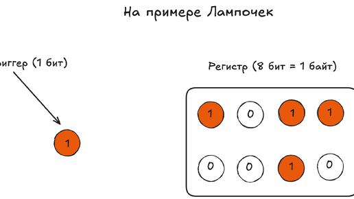 Предыдущий урок: Как работает компьютер? Часть 36. Триггер — простейшая ячейка памяти В прошлом уроке мы познакомились с триггером — самой маленькой ячейкой памяти, которая может хранить один бит: либо 0, либо 1. Но одного бита мало, чтобы описывать полезную информацию. Компьютеру нужны числа, символы, команды, адреса. Для этого триггеры объединяются в группы. Эти группы и называются регистры. Чтобы понять суть регистра, представьте коробочку, в которой стоит несколько лампочек-триггеров подряд. Каждая лампочка может хранить свой 0 или 1, а вместе они образуют маленький «контейнер» для числа...
