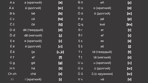 В любом иностранном языке присутствуют буквы и эти буквы надо знать. В чешском алфавите в отличие от русского используются латинские буквы, которых, кстати, аж 42 штуки и все с непонятными ударениями. Давай разбираться... Пойдём по порядку, заодно разберемся с гласными и согласными. Выделяют 3 диакритических знака: Čarka (чарка) – знак в виде ударения, показывающий долготу гласной. Важно запомнить - в чешском языке одна чарка может полностью поменять значение слова, поэтому пренебрегать долготой не стоит...