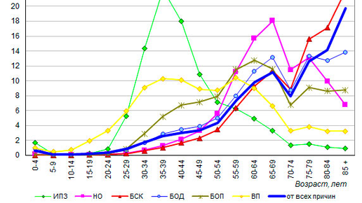 Каждый четвертый из умерших в России не достиг возраста 60 лет При современной продолжительности жизни смерти, наступившие в возрасте до 70 лет, можно считать в большинстве преждевременными. В России, несмотря на наблюдающееся снижение, доля людей младших возрастов среди всех умерших остается сравнительно высокой. Так, по данным за 2018 год, почти каждый десятый не дожил до возраста 45 лет (9,5%), каждый четвертый (24,6%) – до возраста 60 лет, 45,5% не достигли возраста 70 лет, две трети – возраста 80 лет (рис...
