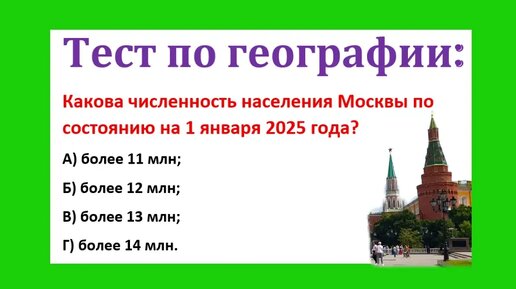 Москва манит не только иностранцев, но и россиян. Многие хотели бы навсегда «осесть» в столице. Привлекает высокая зарплата, перспективы карьерного роста, развитая инфраструктура и насыщенная культурная жизнь. Также среди преимуществ жизни в Москве называют большое количество зон отдыха и низкий уровень преступности. А вы знаете, какова численность населения в Москве по состоянию на 1 января 2025 года? А) более 11 млн; Б) более 12 млн; В) более 13 млн; Г) более 14 млн...