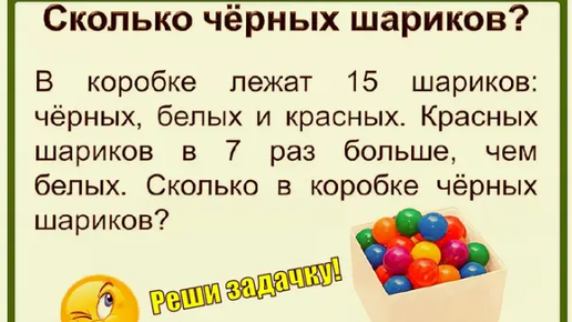 В коробке всего 15 шариков — чёрные, белые и красные. И вот что интересно: красных шариков в 7 раз больше, чем белых! Сможешь вычислить, сколько в коробке чёрных шариков? Включи режим «математический детектив» — пораскинь мозгами и найди ответ! ⏱ Старт! У тебя 40 секунд — успей решить головоломку. ✅ Узнал количество чёрных шариков? Поставь ❤️ лайк, если справился — нам важно знать, что задача тебя зацепила! Напиши в комментариях число чёрных шариков...