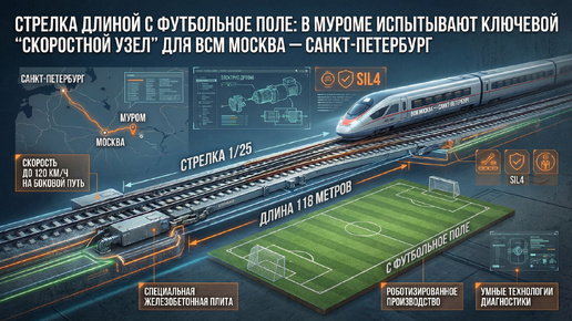 Пока все обсуждают будущий высокоскоростной поезд и обещанные «два часа между столицами», на самом деле судьба всей магистрали решается… в точках, где пути расходятся. Потому что на скорости 300–400 км/ч стрелочный перевод — это не «железка сбоку», а настоящий экзамен на точность, надежность и безопасность. И вот как раз такой экзамен начался на Муромском стрелочном заводе: там стартовали заводские испытания уникального стрелочного перевода марки 1/25, специально для первой в России ВСМ Москва - Санкт-Петербург...