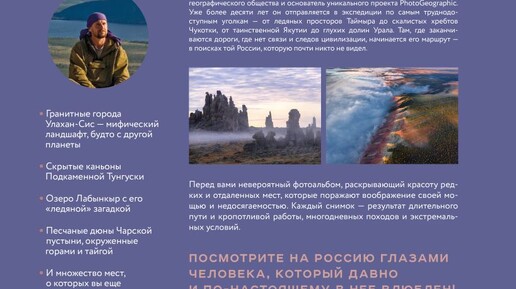 В этом году в издательстве Эксмо была издана моя книга-фотоальбом "Сокровища России". В авторском издании, в формате художественной фотографии, представлены уникальные ландшафты страны, которые по большей части мало кому знакомы. Это плод многолетней фото-экспедиционной деятельности в рамках проекта Photogeographic. Книга продаётся в Озоне и Читай Городе. Но здесь я хочу показать все страницы этого фотоальбома вместе с текстами и фотографиями. Правда, не в том варианте как она вышла из печати, а в моём авторском...