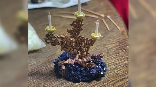 Мастер-микроминиатюрист Владимир Анискин сделал их специально для санкт-петербургского Музея истории свечи. Самое удивительное в том, что эти свечи полноценно, хоть и недолго, горят. Чтобы воск не плавился сразу после зажигания, мастеру нужно было рассчитать соотношение размеров микроскопического фитиля и самой свечи. Диаметр самой маленькой в мире свечи составил всего 2 мм, а фитиля — вообще полмиллиметра, рассказало издание «Сиб.фм». Подсвечник Анискин сделал из лазурита с самородками меди, а сами чаши украсил сусальным золотом...