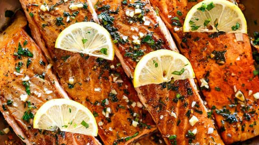 Обжаренная на сковороде горбуша с лимонно чесночным сливочным соусом.