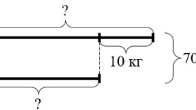Задача. В двух мешках 70 кг картофеля, при этом в первом мешке на 10 кг картофеля больше, чем во втором. Сколько килограммов картофеля в каждом мешке? Решение.Изобразим с помощью отрезка количество картофеля во втором мешке. Тогда количество картофеля в первом мешке можно представить в виде отрезка, который больше второго. По чертежу видно, что если количество картофеля во втором мешке составляет 1 часть, то количество картофеля в первом мешке составляет также 1 часть и еще 10 кг. I способ. Если убрать 10 кг из первого мешка, то в мешках картофеля станет поровну...