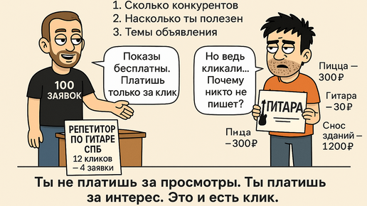 Это и называется оплата за клик. Ты — продавец на улице с табличкой «Ремонт айфонов».