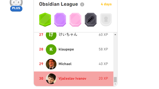 В Duolingo наших дней есть разноцветные лиги. Если делать много уроков в течение недели, можно перейти в следующую, более престижную лигу вплоть до „бриллиантовой“. Если перестать заниматься, провалишься на лигу вниз. Можно сказать, что это бесполезная ерунда, но бесполезна она ровно настолько же, насколько любая другая такая игровая ерунда в нашей жизни: повышение без новой зарплаты, но с престижным чином; уровень в видеоигре и всё такое. В общем, может быть важно :) Так вот, если место в лиге „красное“ (кандидат на вылет), можно поучаствовать в событии Duolingo — за это дают сразу 250 XP...
