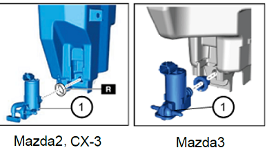 Некоторые клиенты автомобилей Mazda3 (BP), выпущенных до 2020.09.02; Mazda2 (DJ), выпущенных до 2020.08.04 и CX-3 (DK) – до 2020.08.19 могут жаловаться на то, что частота долива жидкости для омывателя стекол выше, чем ожидалось, или на наличие следов утечки жидкости под мотором омывателя (1) после стоянки автомобиля. Это вызвано трещиной, которая может возникнуть на стыке корпуса двигателя насоса из-за неправильного процесса его сборки. Чтобы устранить эту проблему, конструкция двигателя омывателя была изменена, и теперь он не имеет соединительной секции...