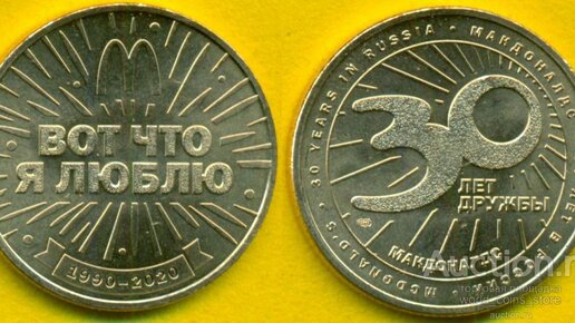 Макдоналдс выпустил серию жетонов, которую приурочил к юбилею работы в России. Получить жетон можно было так: при покупке «Большой Комбо» с 25.11.2019 до 05.01.2020 давался жетон в картонной упаковке. Этот жетон до 31.01.2020 (день открытия первого ресторана Макдональдс в России в 1990 году) можно обменять на гамбургер, капучино или на другие позиции по Акции. Другими словами эта монетка не просто сувенир на память, а «Коин», т.е. платежный жетон. А значит предмет уже можно класть в коллекцию! Тираж заявлен в 6 млн...