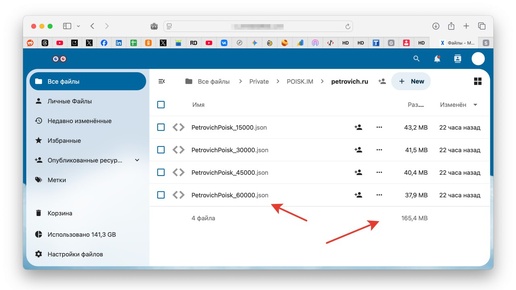 Сколько места занимает парсинг ПЕТРОВИЧ по Москве с характеристиками. Все товары. На картинке скрин с облака (частного) NextCloud. Мы не сжимаем, хотя думали давно. json формат всем удобне. Мы не нагружаем, поэтому сбор идет очень неспешно, но за сутки двое можно собрать все фактические данные...