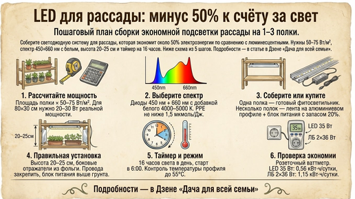 Для подсветки рассады лучше всего работает светодиодная система на 50-75 Вт на квадратный метр с реальным PPE не ниже 1,5 мкмоль/Дж, спектром 450 нм + 660 нм и добавкой белого. Ставим лампы на высоту 20-25 см, подключаем через таймер на 16 часов в сутки и закрываем боковины отражающим материалом. В таком исполнении у нас стабильно выходит минус 50% к расходу электричества по сравнению с люминесцентными или ДНаТ, а сеянцы низкие, коренастые. В шесть утра у меня щёлкает механический таймер, в кухне чуть пахнет влажной землей из кассет, на стекле тонкий иней...